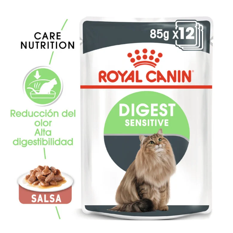 Royal Canin Digest Sensitive es un alimento húmedo formulado bajo control veterinario en deliciosos filetes de carne en salsa para la nutrición diaria de gatos adultos sanos o con problemas de sensibilidades digestivas.